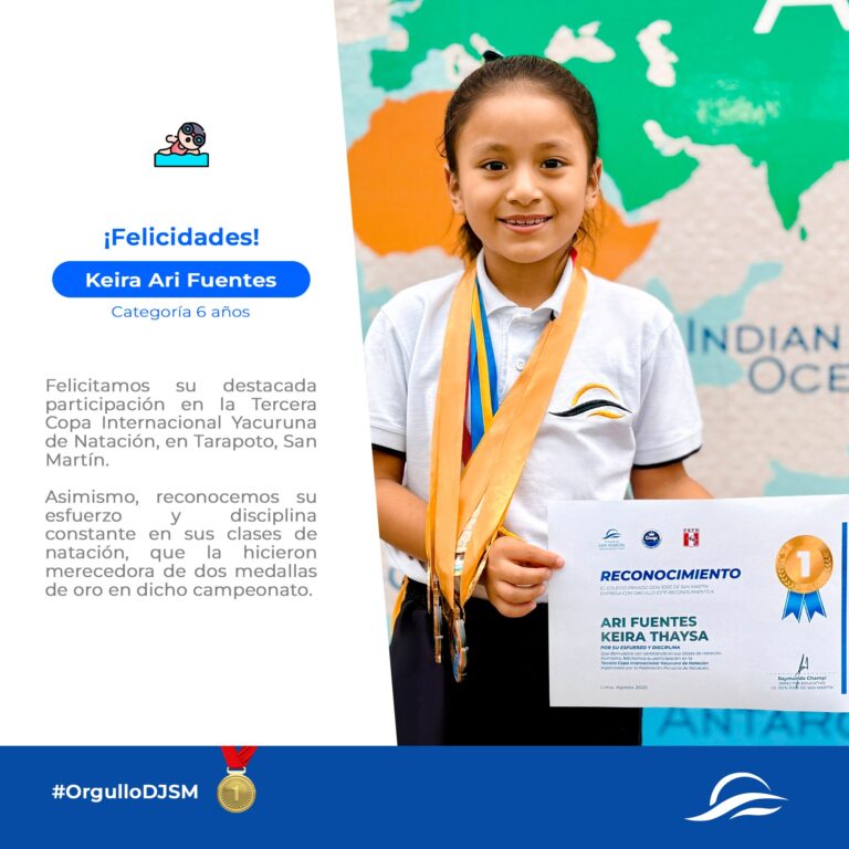 ¡Orgullo DJSM! 🩵🏊 Nuestra campeona Keira Ari Fuentes brilló en la Tercera Copa Internacional Yacuruna de Natación en Tarapoto, San Martín, llevándose 2 medallas de oro en la categoría 6 años. Con esfuerzo, disciplina y una gran pasión por la natación, Keira demuestra que los sueños se alcanzan con dedicación.