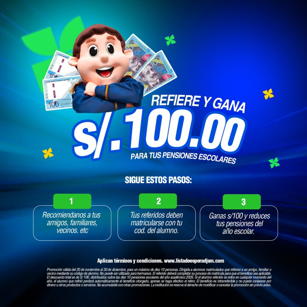 El descuento total es de S/ 100, distribuidos sobre las diez 10 pensiones escolares del año académico 2026. Si el alumno referido se retira en cualquier momento del año, el alumno que refirió perderá automáticamente el beneficio otorgado, apenas se haga efectivo el retiro.